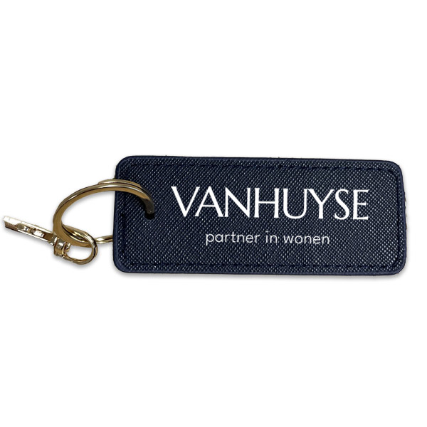 Deze VanHuyse sleutelhanger is donker blauw en van 100% imitatieleer van polyurethaan. Fijnkorrelig saffianoleer. Sleutelring is van glanzend metaal goudkleur.