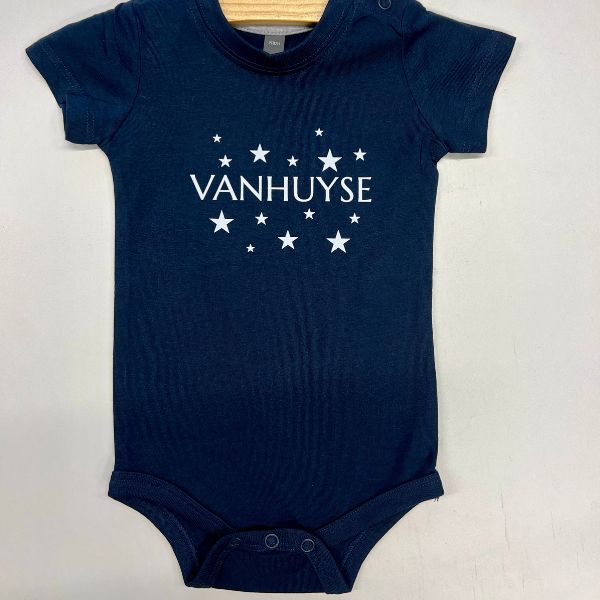 Romper met VanHuyse logo en sterren. Kleur donker blauw. Leuk als relatie geschenk bij een geboorte.
